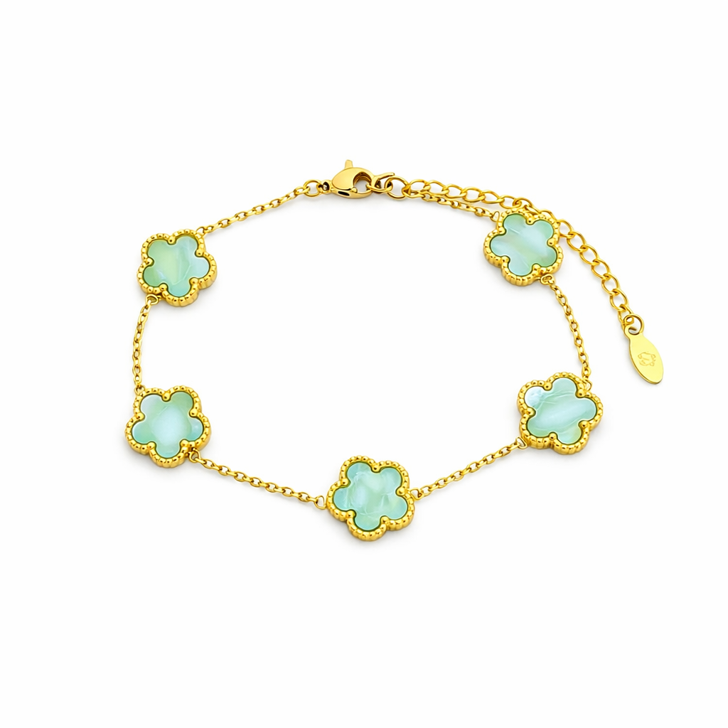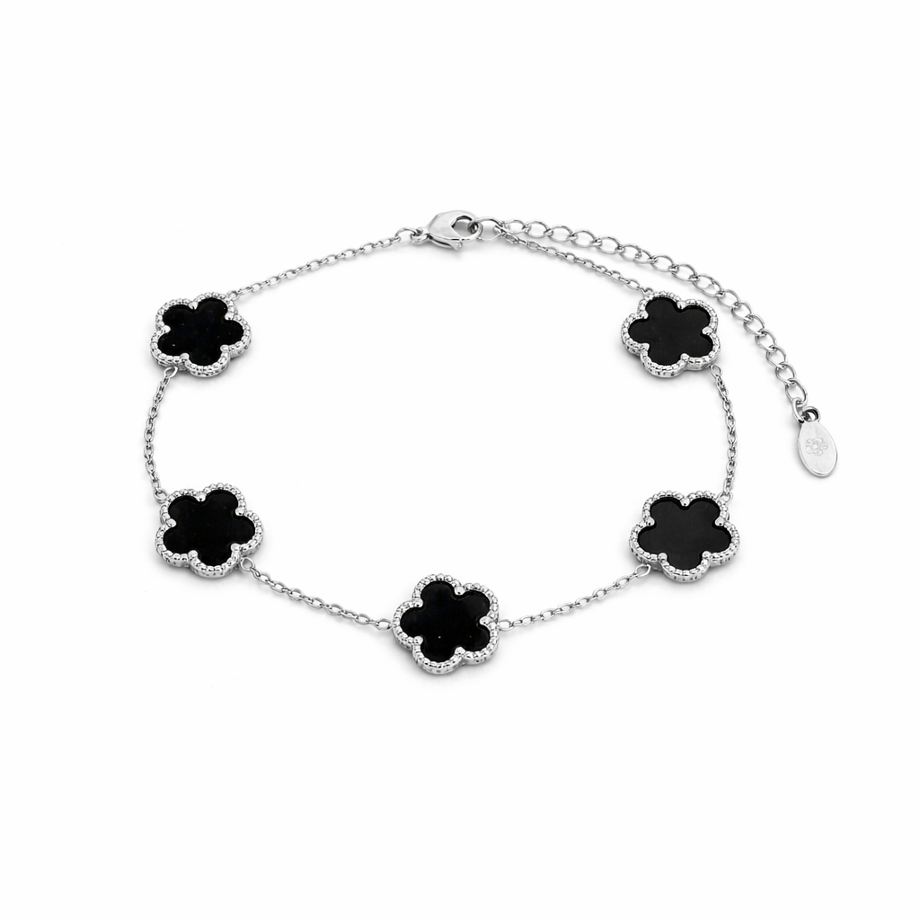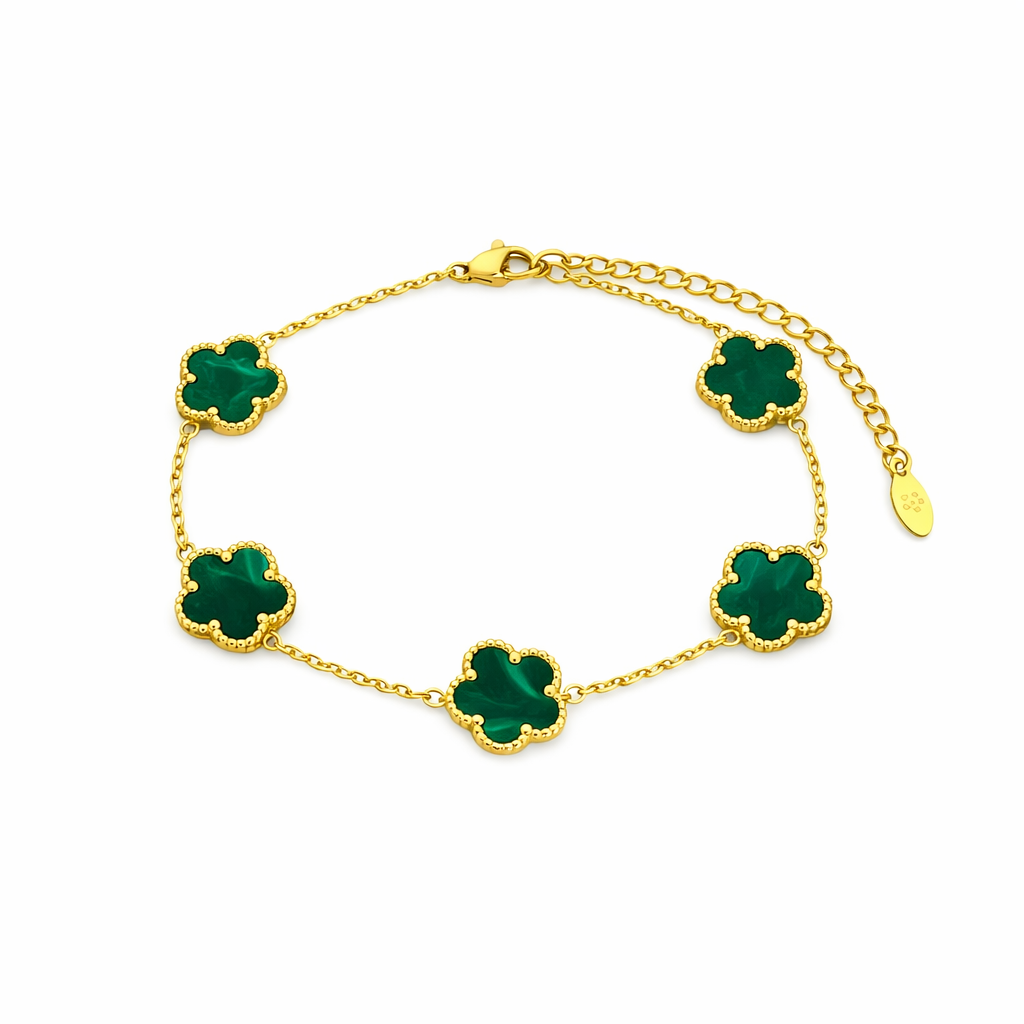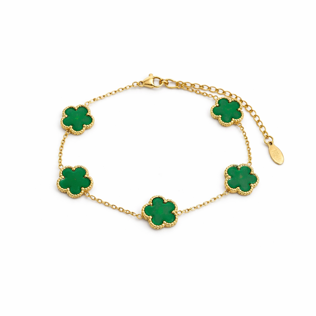 Dieses elegante Kleeblatt-Armband vereint zeitloses Design mit einem modernen Glücks-Symbol. Die 5 Kleeblatt-Motive sind harmonisch auf der feinen Kette verteilt und machen das Armband zum perfekten Begleiter – ob im Alltag, im Büro oder zu besonderen Anlässen. Dank Karabinerverschluss mit Verlängerungskette sitzt es bequem und lässt sich ideal mit anderen Armbändern kombinieren.