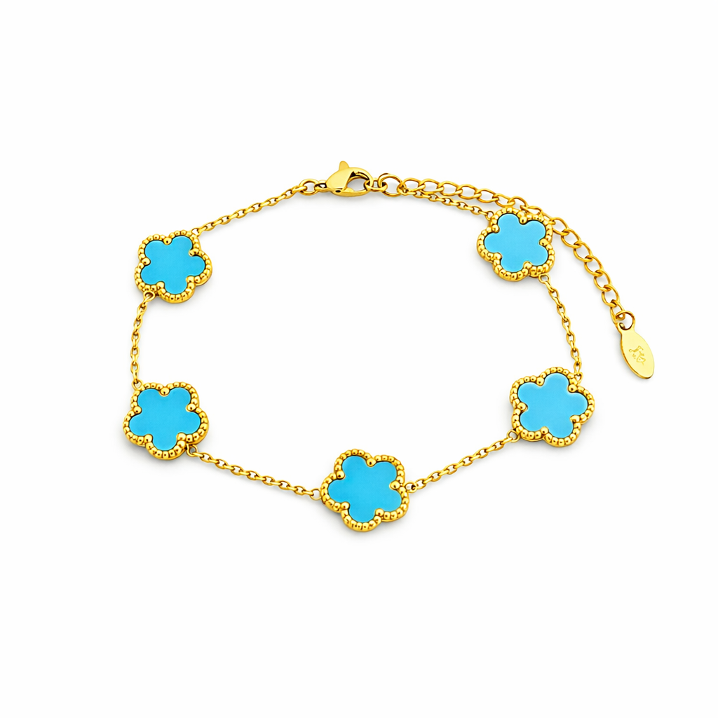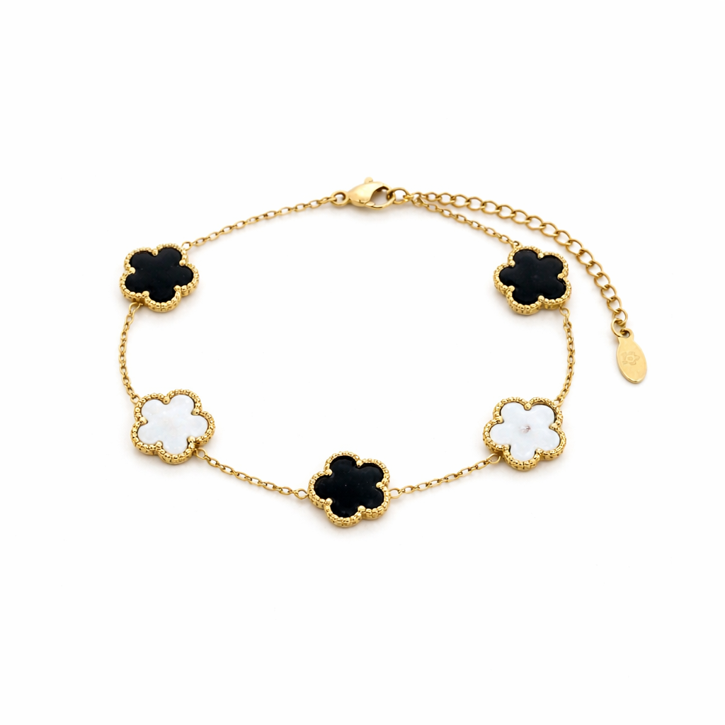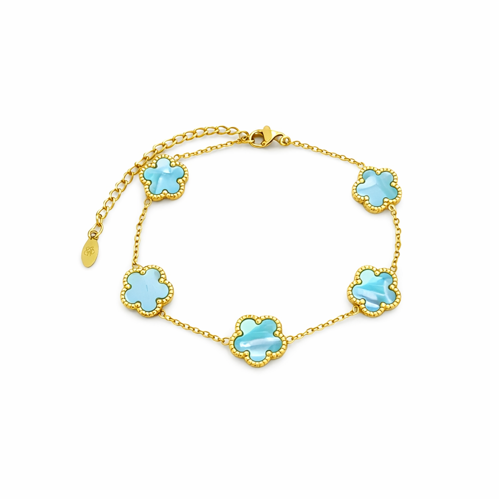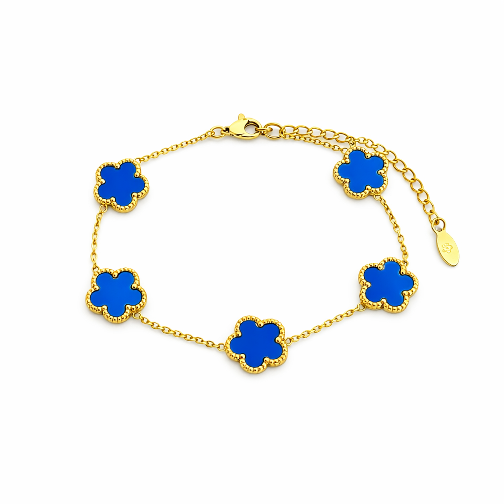Dieses elegante Kleeblatt-Armband vereint zeitloses Design mit einem modernen Glücks-Symbol. Die 5 Kleeblatt-Motive sind harmonisch auf der feinen Kette verteilt und machen das Armband zum perfekten Begleiter – ob im Alltag, im Büro oder zu besonderen Anlässen. Dank Karabinerverschluss mit Verlängerungskette sitzt es bequem und lässt sich ideal mit anderen Armbändern kombinieren.